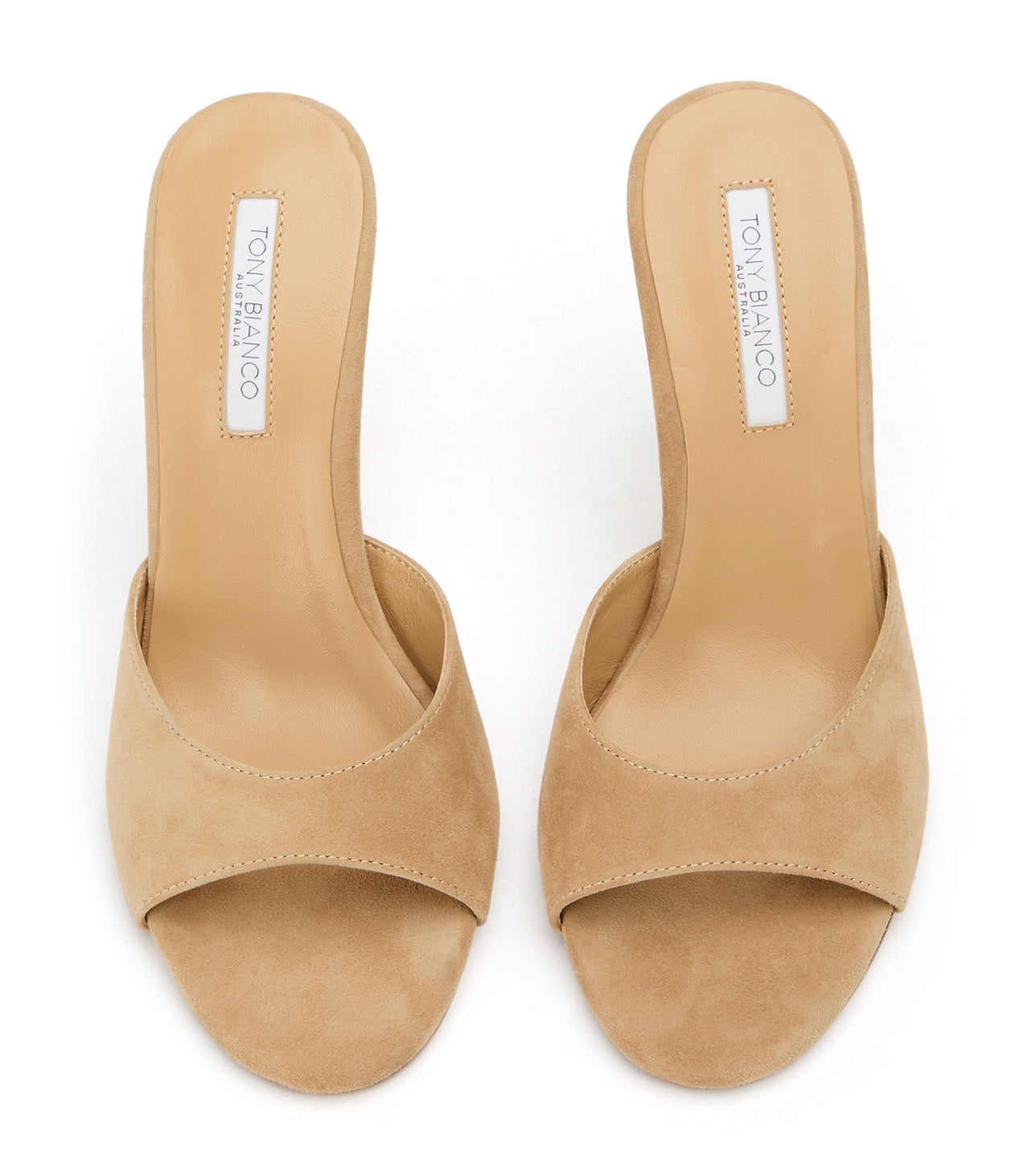 Slip into elevated style with Victoria. Crafted in suede leather, this mule heel features an open toe, curved vamp, and a thicker heel base for comfort and refined appeal.